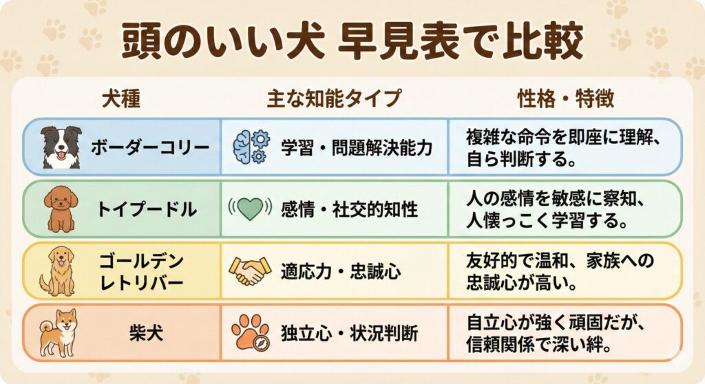 犬の知能を比較する際、頭のいい犬の早見表が非常に役立ちます。この表は、犬種ごとの知能レベルや特性を簡潔に示し、一目でそれぞれの犬種の特徴を把握することができます。
